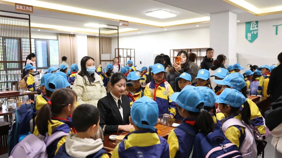 孩子们有序探访了茶艺室、模拟导游、白酒文化与酿造工艺展示中心等特色专业实训室。在专业教师的生动讲解和沉浸式互动体验中,孩子们不仅看见了家乡特色产业的模样,更“触摸”到了工匠精神所蕴含的专注与坚持。